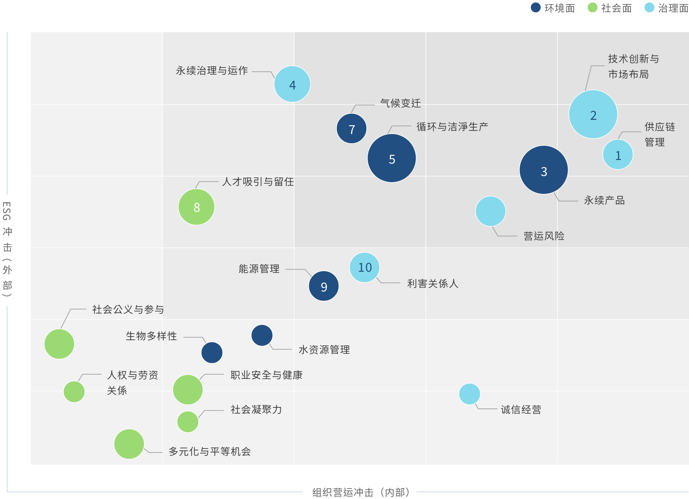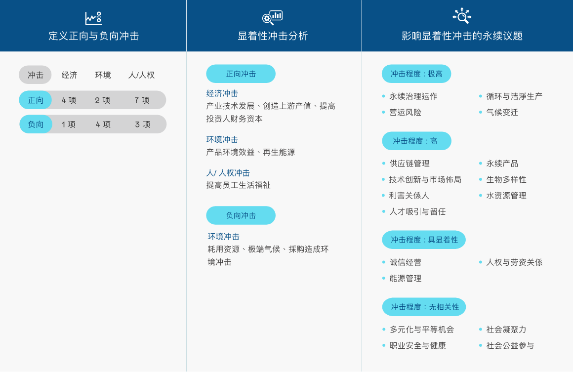 依循全球永续趋势与GRI 准则检视议题之合适性,透过问卷了解利害关系人对公司在环境、社会( 含人权)、公司治理三方面的关注面向,同时建立双重重大性评估方法,透过www.乐鱼主管与价值链的关键伙伴评估ESG 议题对公司所产生的营运冲击程度,并在ESG 外部永续发展冲击方面,根据GRI 通用准则2021(GRI Universal Standards 2021) 的GRI 3:重大主题(Material Topics 2021),整合价值平衡联盟(Value Balancing Alliance, VBA)、哈佛商学院「影响力加权会计(Impact-Weighted Accounts)」研究计画等机构发展之经济、环境及社会层面冲击评估方法学,建构以冲击为基础的重大性分析流程,辨识重大性主题。