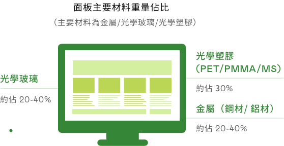 www.樂魚主要產品顯示器面板,面板製造原物料主要使用為玻璃基板與半導體製程所製造之顯示器液晶盒再與相關零件和物料組裝。為選用低環境負荷與風險之原物料,我們於產品生命週期原物料階段,即對我們所使用的原物料進行關鍵原物料之分析評估,包含材質以及重量占比。再依分析結果定義關鍵原物料,優先導入再生物料的使用。
