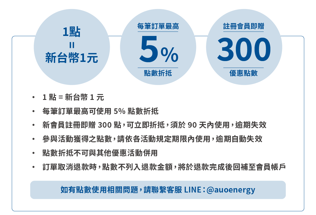 如有其他問題,歡迎透過「聯絡我們」或官方 LINE(@auoenergy)與我們聯繫,客服將儘速為您服務。