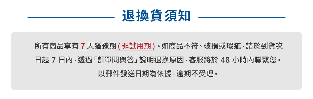 • 若已進入「出貨作業」,則無法取消,請於到貨 7 日內依鑑賞期規定申請退訂。