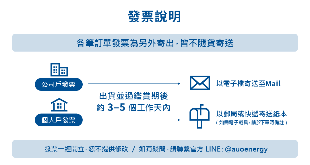 商品備妥後,我們將透過「訂單問與答」通知,請回覆希望到貨日,或透過官方 LINE(@auoenergy)聯繫安排出貨。