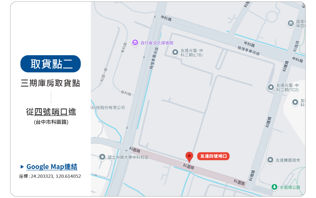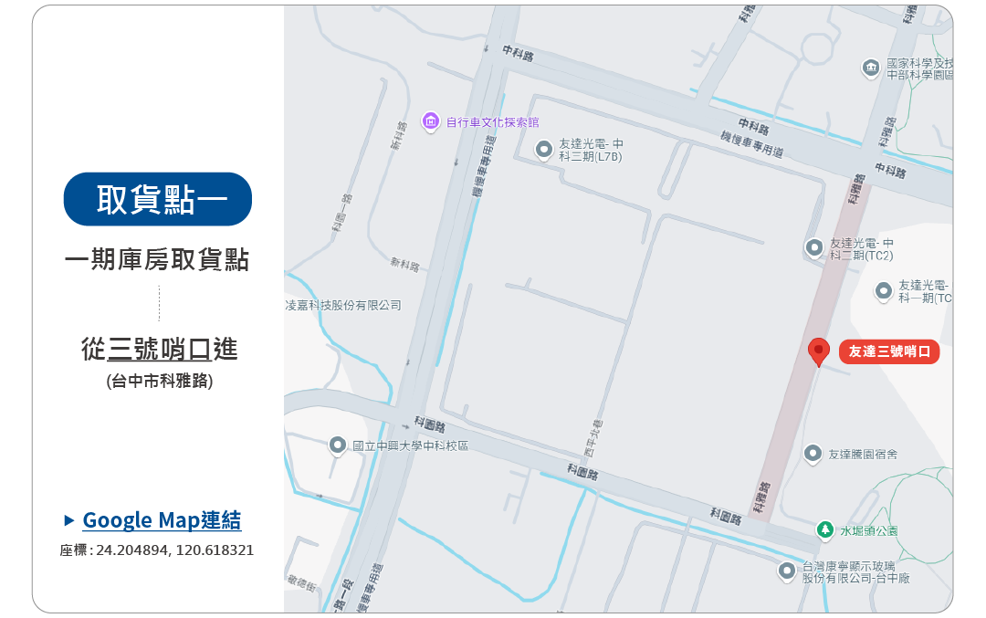 • 三期庫房:台中市科園路,座標:24.203323, 120.614052(從四號哨口進入)。