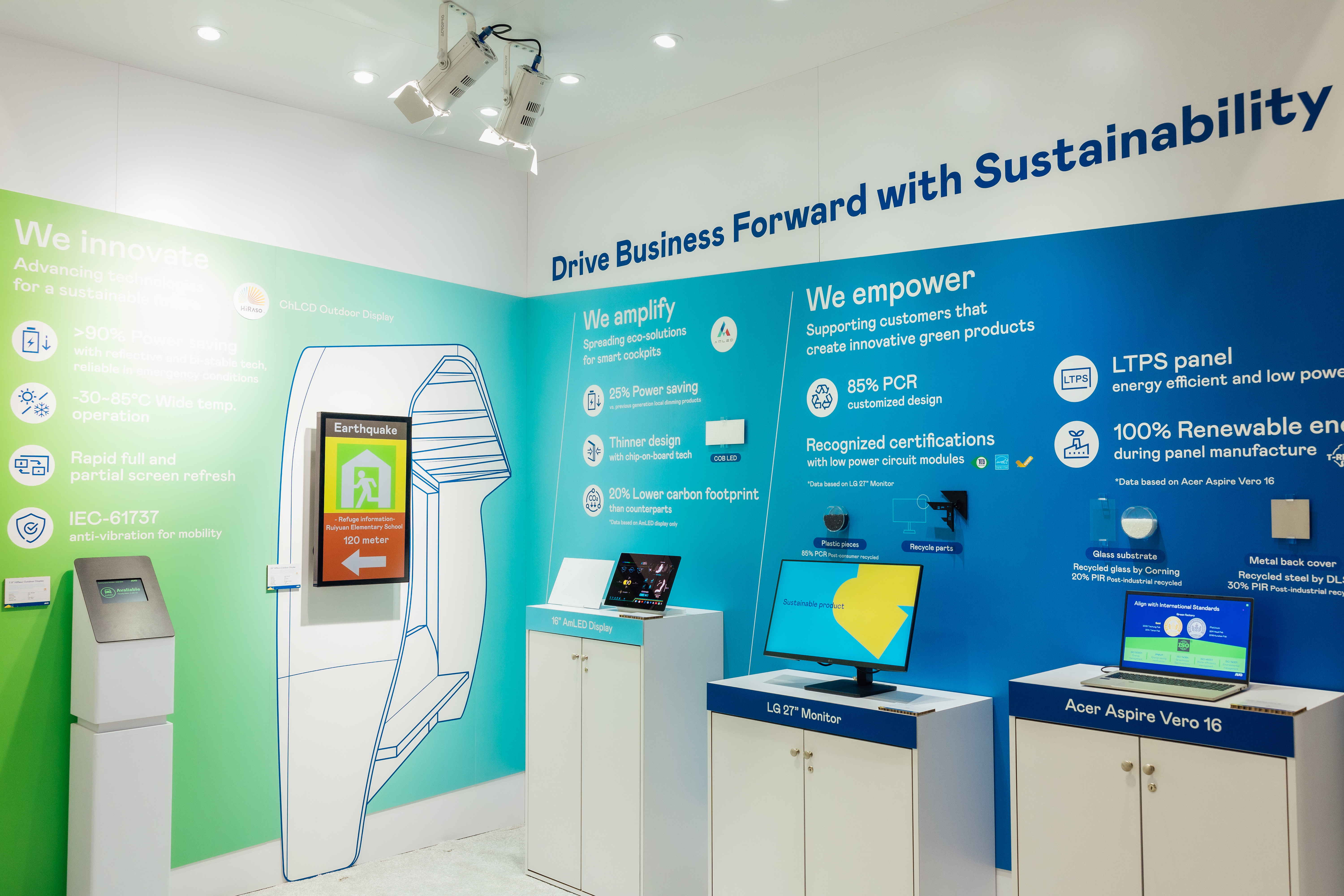 AUO utilizes innovative display technology HiRaso (Cholesteric Liquid Crystal Display, CHLCD with Bi-stable technology) to achieve zero energy consumption in their displays, expanding power-saving AmLED display technology to automotive products and applying post-consumer recycled (PCR) plastics and panels produced with 100 Perecent Green electricity to notebooks and monitors, thereby increasing green value.