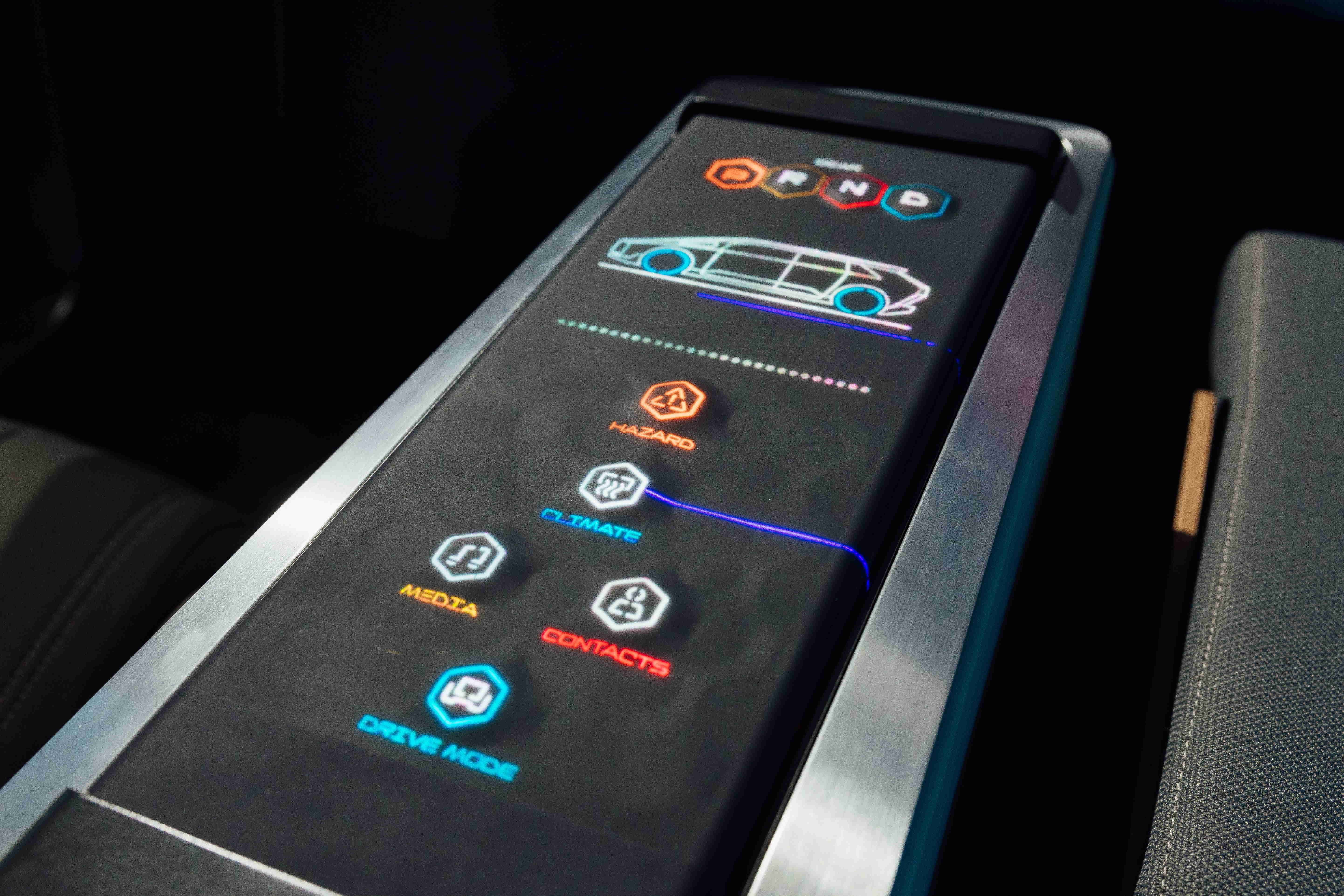 Morphing Center Control has a dynamically adjutable surface. When not in use, the Morphing Control Center displays information on the surface of the central console. When specific functions are activated, the buttons rise and provide tactile feedback, demonstrating a new way for human-machine interaction.